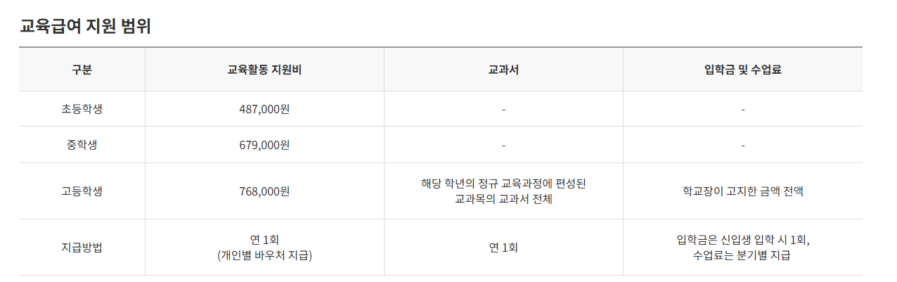 | 지원금 성격 | 현금 또는 전자바우처 지급 | 교과서·입학금·수업료 등 실비 지원 |