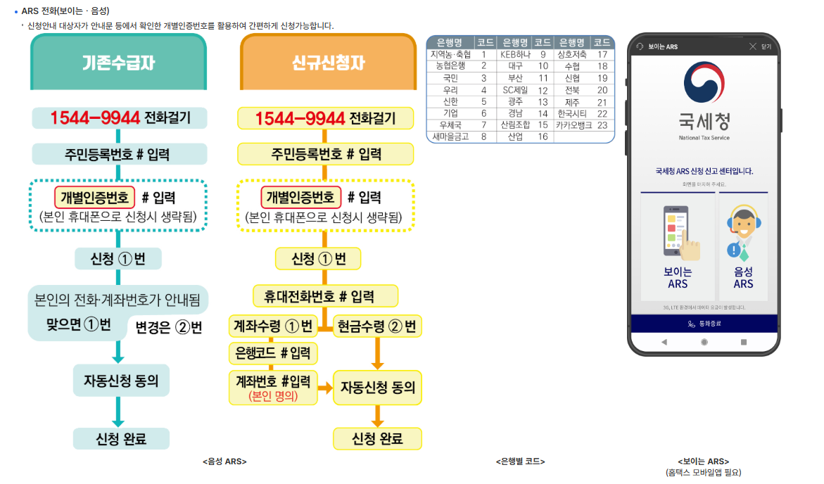 - 국세청 ARS(1544-9944)를 통해 음성 안내에 따라 신청할 수 있습니다.
