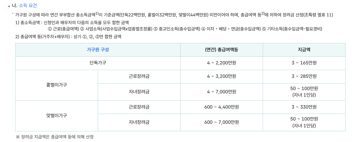 - 단독가구: 총소득 2,200만 원 미만