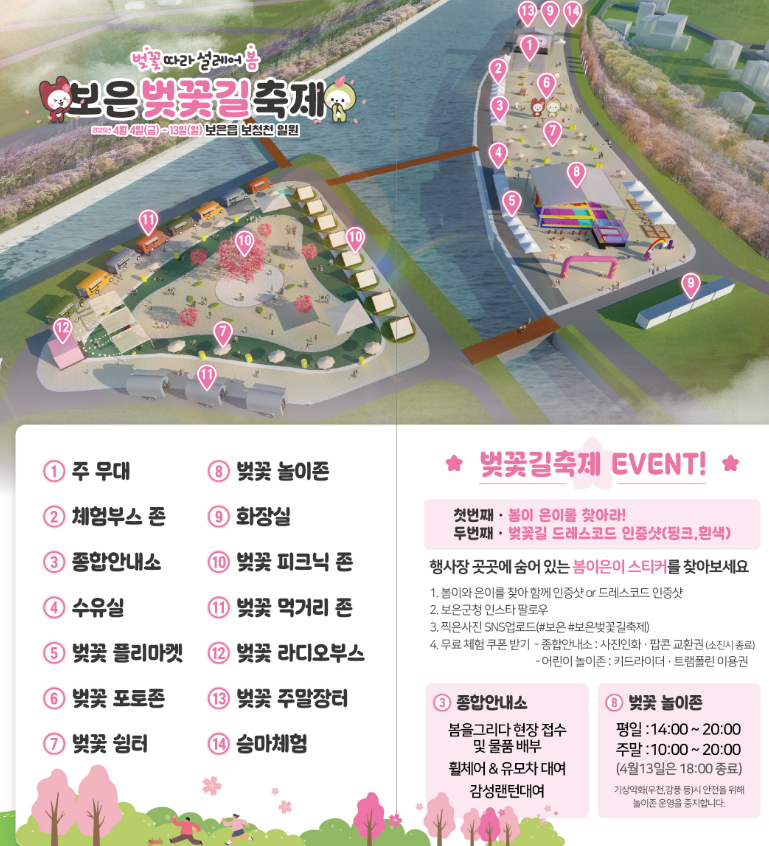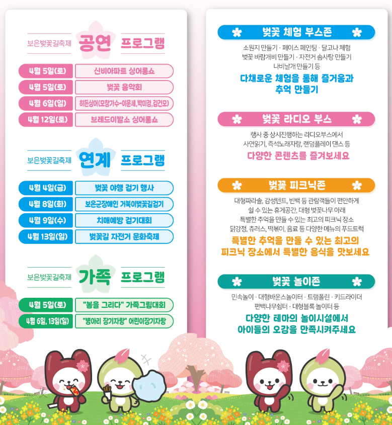 이번 축제는 “우리가 사랑한 봄, 꽃”이라는 따뜻한 주제 아래, 만개한 벚꽃을 배경으로 걷기만 해도 힐링이 되는 보청천 벚꽃길을 중심으로 다채로운 프로그램들이 운영됩니다.