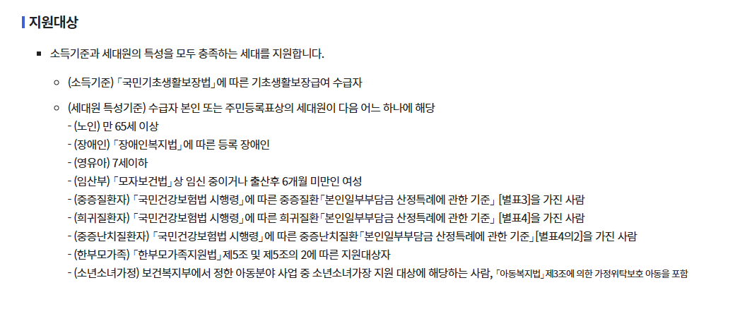 💡 즉, ‘저소득층 + 취약계층 세대’가 주요 지원 대상입니다.