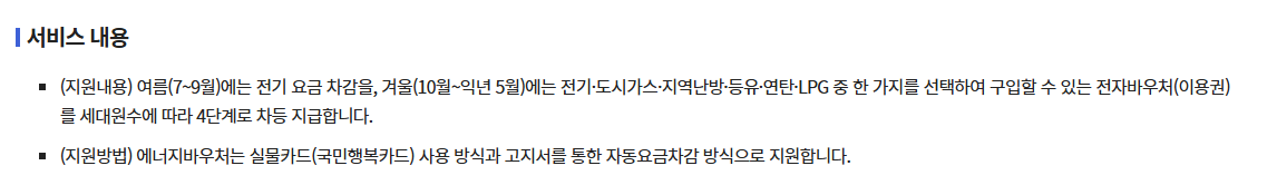 - 전자바우처(이용권) 방식으로 국민행복카드 지급 또는 자동 요금 차감
