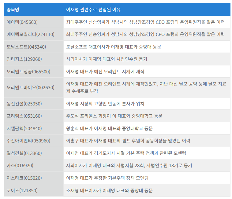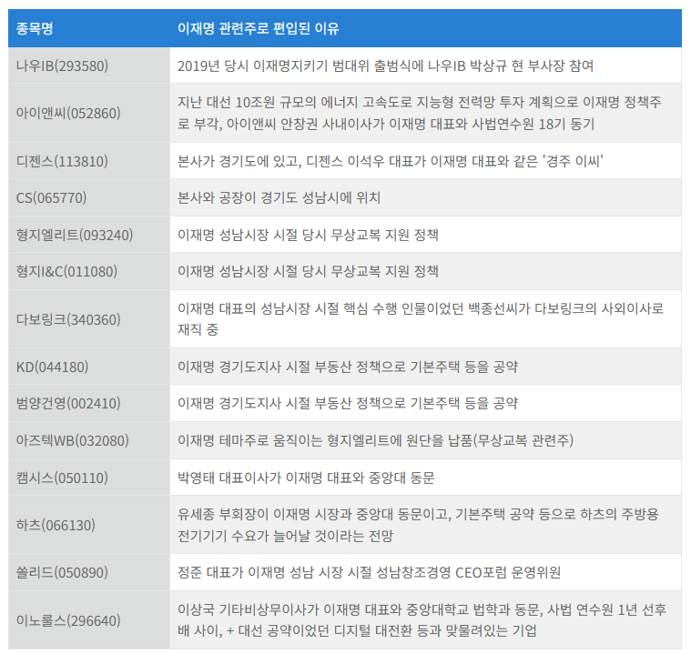 정치 테마주는 실제 수혜 여부와 무관하게 단순한 인맥, 지역 연고, 언론 노출 하나만으로도 시장에서 관련주로 인식됩니다. 특히 이재명 대표는 과거 성남시장과 경기도지사를 역임하며 다양한 정책을 펼쳐 왔고, 이에 따라 성남이나 경기권에 본사를 둔 기업들이 집중적으로 연결됩니다.