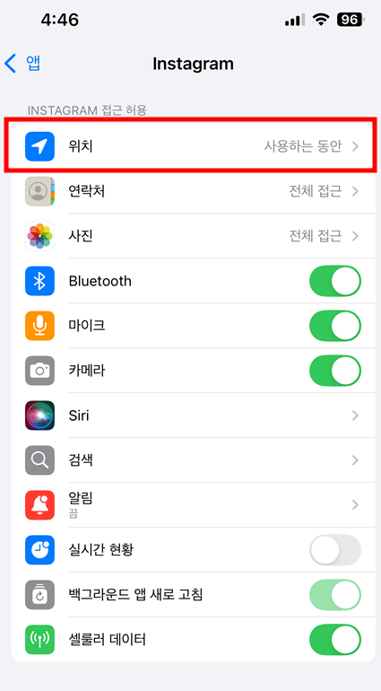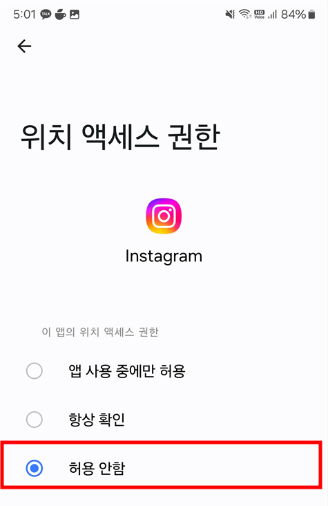 - 설정 > 위치 > 앱권한 > Instagram > '허용 안 함' 선택