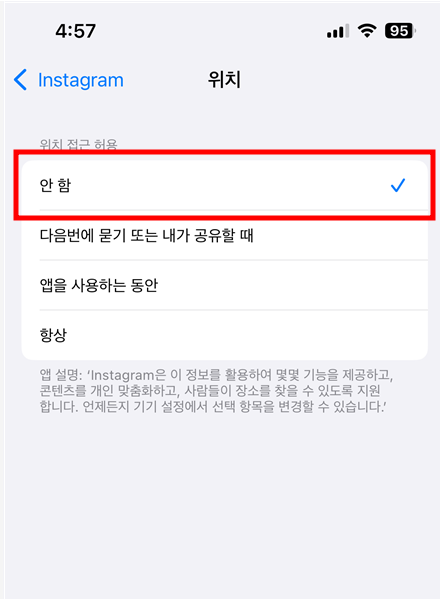 - 설정 > 앱 > instagram > 위치 > '안 함' 선택