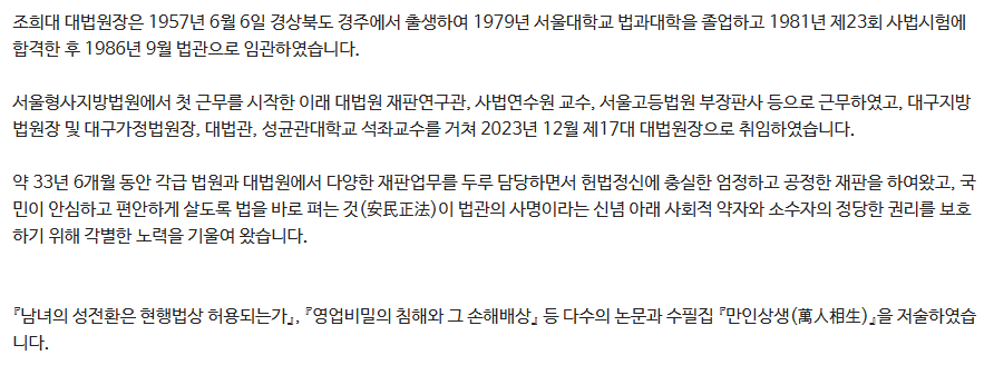 조희대 대법원장은 법관으로서의 경력 대부분을 재판 중심으로 쌓아온 인물입니다.