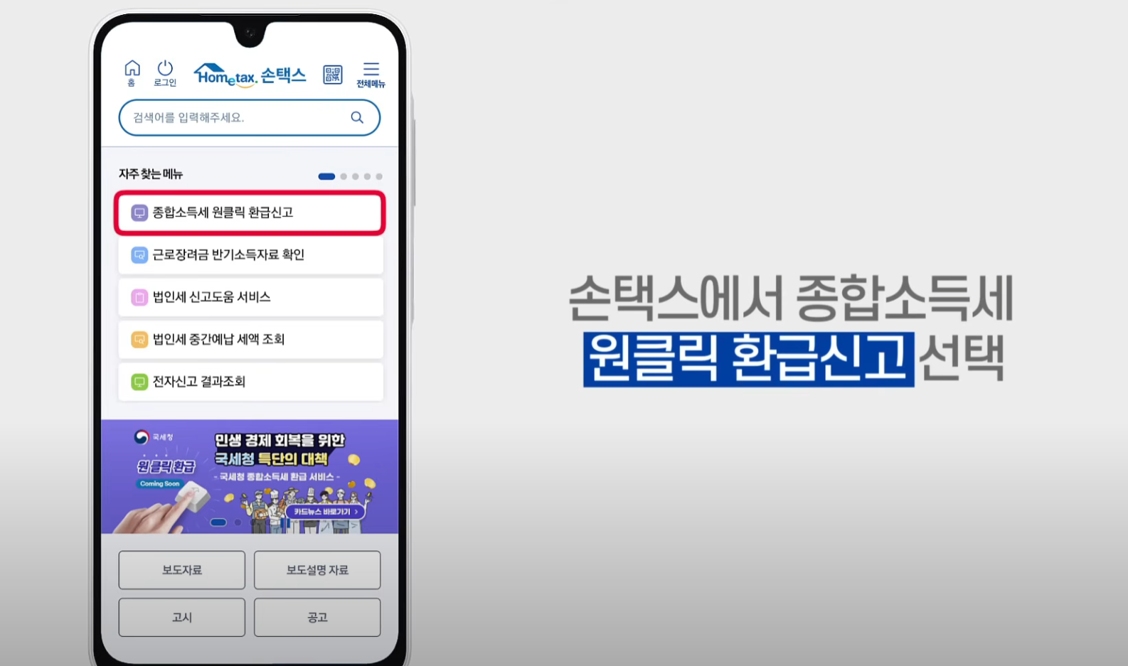 - 메인 화면에서 ‘원클릭 환급신고’ 버튼 클릭