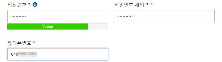 - 비밀번호 왼쪽 오른쪽 동일하게 입력하고 핸드폰 번호 입력