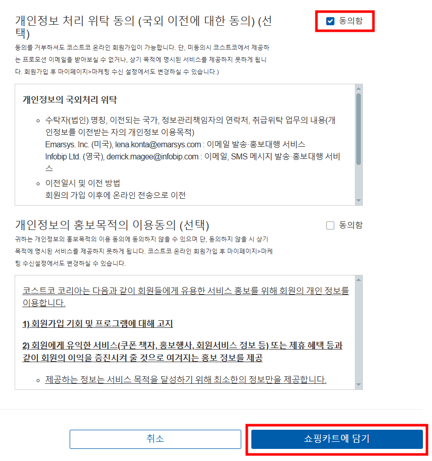 - 읽어보고 동의시 체크 후 오른쪽 하단 '쇼핑카트에 담기' 클릭