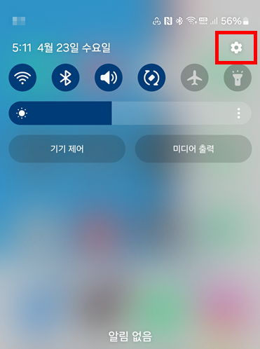 1. 핸드폰 화면을 위에서 아래로 스와이프 하여 설정 버튼은 누른다.