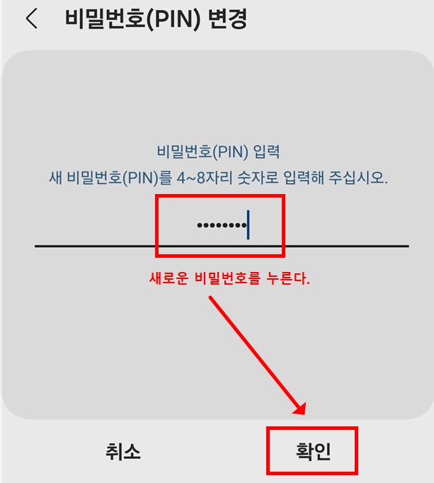8. 새로운 PIN 번호를 한번 더 누르고 완료를 누른다.