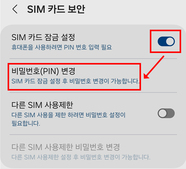 6. SIM 카드 잠금 설정 오른쪽을 터치하여 활성화한다.